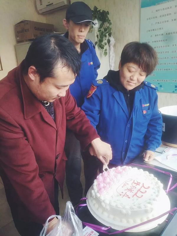 在這個(gè)值得慶祝的時(shí)刻,有一位多年乘坐222路公交車的鐵粉兒,得知20日是222路開(kāi)通整40周年的日子,特意為車隊(duì)送來(lái)了自己訂做的蛋糕,上面寫(xiě)著:風(fēng)雨同路四十載,此刻共慶2018年!