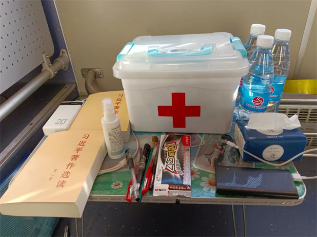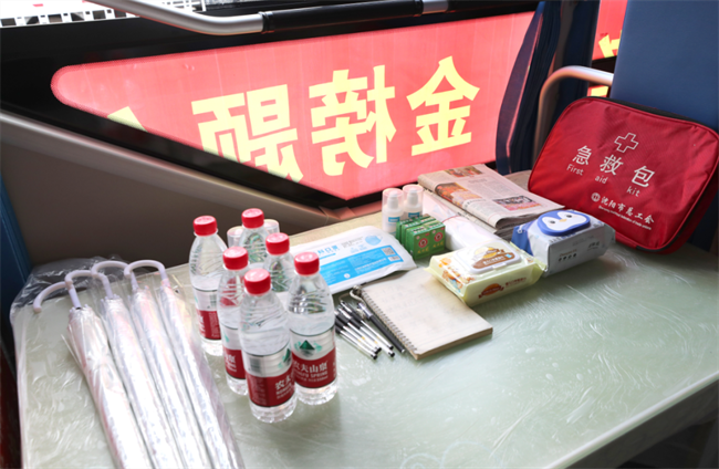 “黃河服務(wù) 千家萬戶”“助力考生 金榜題名”等醒目的祝福標(biāo)語掛滿了車身,在車廂內(nèi)準(zhǔn)備了急救包、風(fēng)油精、暈車藥、創(chuàng)可貼、口罩、礦泉水、雨傘、報(bào)紙等物品,應(yīng)有盡有,供大家隨時(shí)取用。