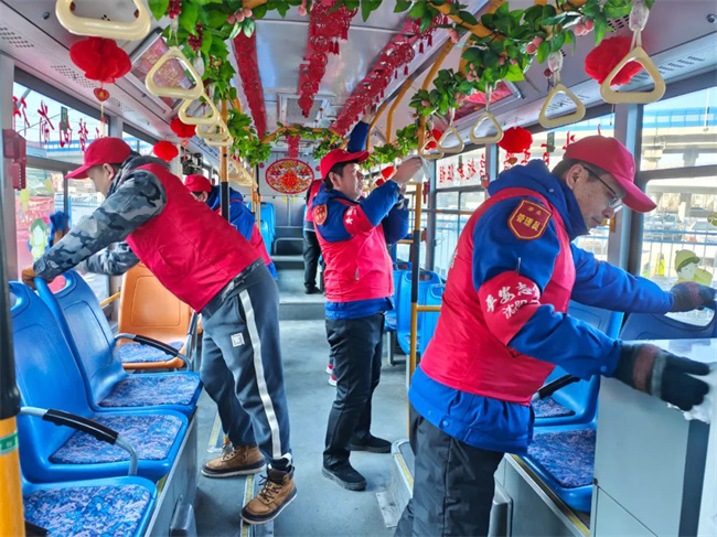 近日,211.222路黨支部全體黨員干部職工在龍之夢公交樞紐站開展清潔運營車輛、場區(qū)候車廊及站務室活動,打造年味公交。