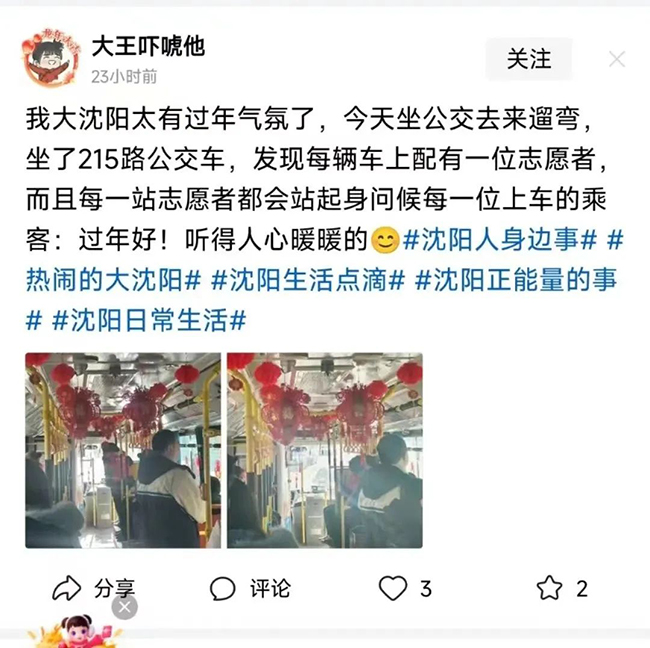 “我大沈陽太有過年氣氛了,今天坐公交車出去遛彎,坐了215路公交車,發(fā)現(xiàn)每輛車上配有一位志愿者,而且每一位志愿者都會站起身向上車的乘客說一聲‘過年好’,聽得人心暖暖的。”這是網(wǎng)上的一則評論,作為一名公交人,看到網(wǎng)友對我們工作的肯定,也讓我們備受鼓舞。