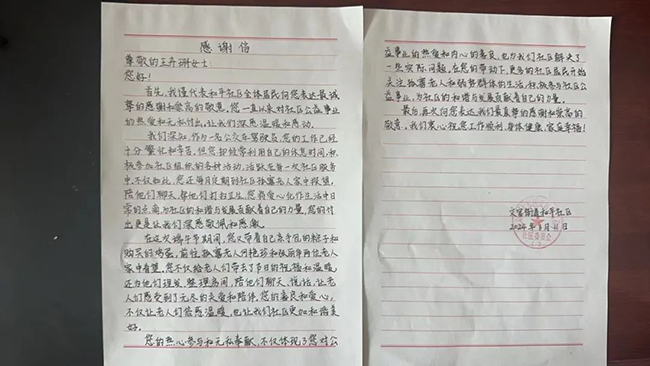 王卉珊的暖心善舉讓文官街道和平社區(qū)的書記深受感動,社區(qū)書記特地寫了一封感謝信,來到212路車隊親手交到王卉珊手中,向王卉珊表示最誠摯的謝意和崇高的敬意。