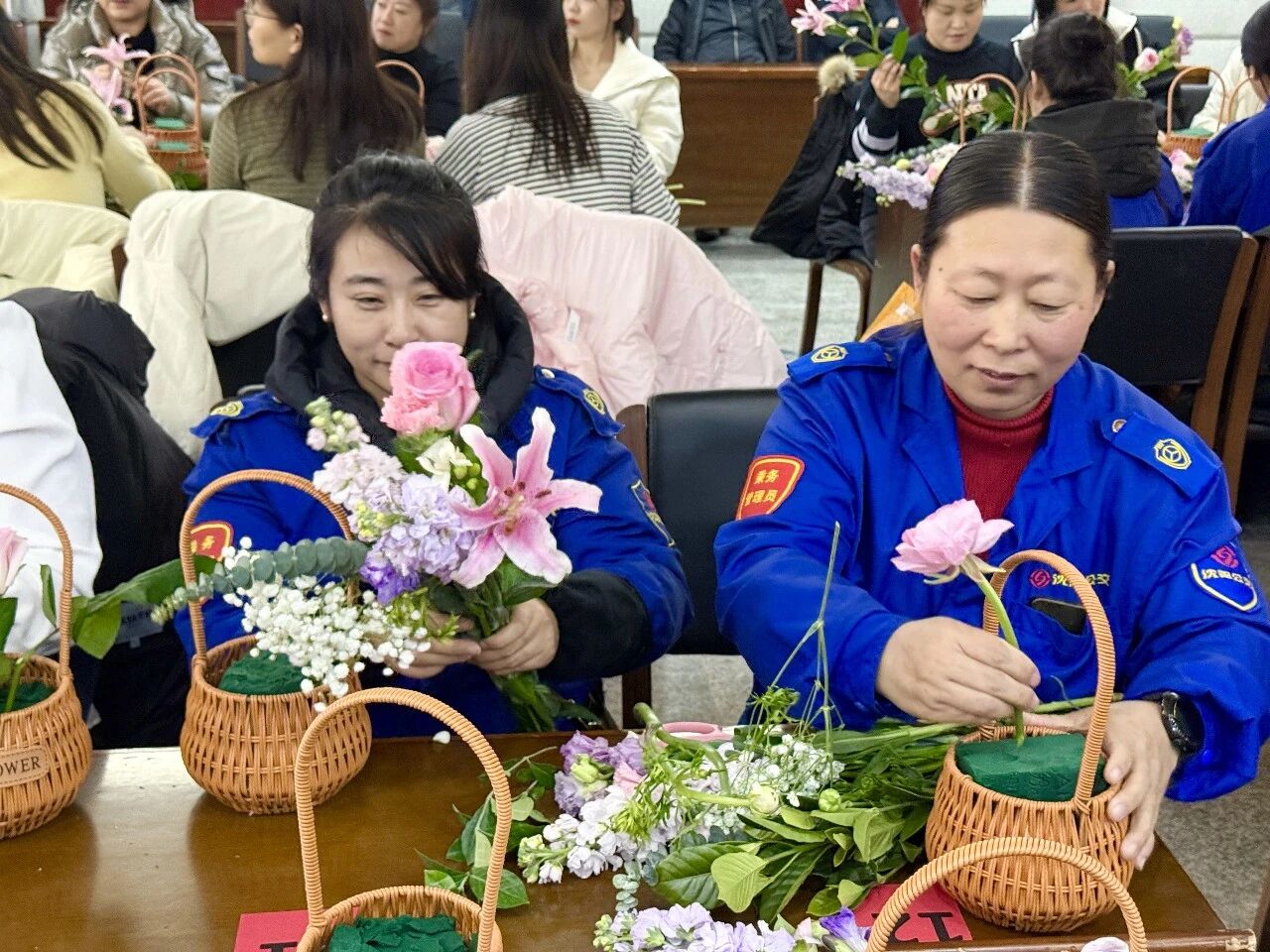 隨后,活動(dòng)進(jìn)入了令人期待的花藝創(chuàng)作環(huán)節(jié)。集團(tuán)工會(huì)特別邀請(qǐng)了專業(yè)花藝講師進(jìn)行現(xiàn)場(chǎng)教學(xué)。伴隨著輕柔的音樂(lè),女職工們充分發(fā)揮想象力和創(chuàng)造力,她們或凝神構(gòu)思,或精心修剪,或熱烈討論。玫瑰的嬌艷、康乃馨的溫馨、洋桔梗的雅致……原本普通的花枝在她們的巧手修剪與創(chuàng)意組合下,變成了一籃籃錯(cuò)落有致、生機(jī)盎然的藝術(shù)品。每一件作品都蘊(yùn)含著對(duì)美的理解和對(duì)生活的熱愛(ài),現(xiàn)場(chǎng)花香與笑聲交織,氣氛溫馨而熱烈。